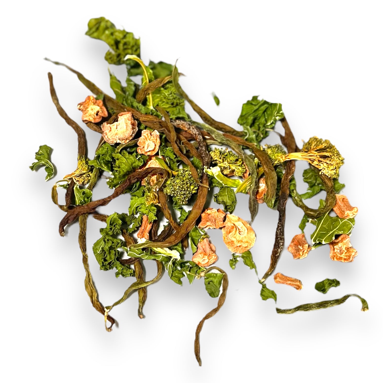 Introducing Veggie Tailz, our nutritious Dehydrated Vegetable Topper that will add a burst of wholesome goodness to your dog's meals. Made with a delicious blend of broccoli, kale, green beans, and carrots, Veggie Tailz is packed with essential vitamins, minerals, and fiber to support your dog's overall health.